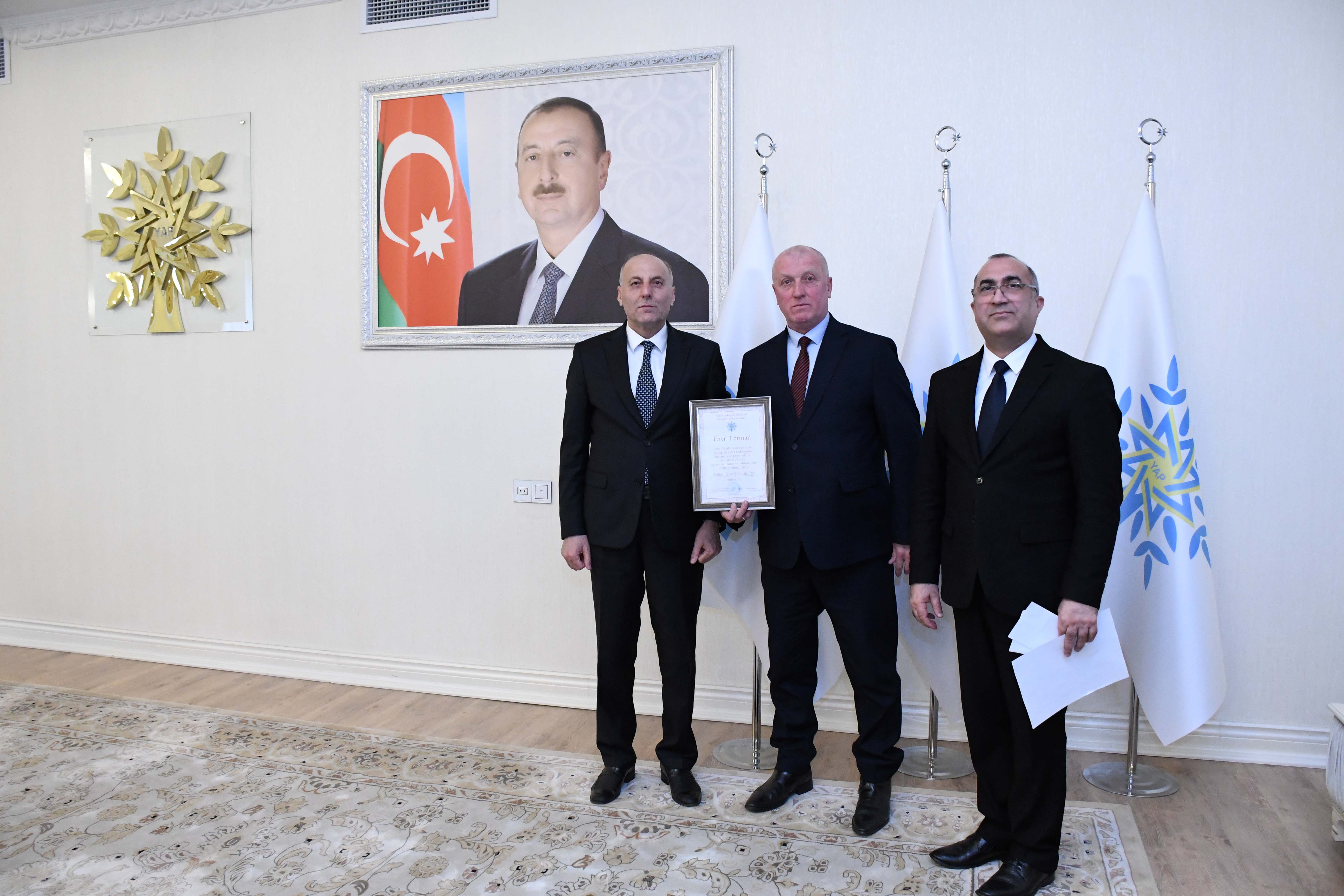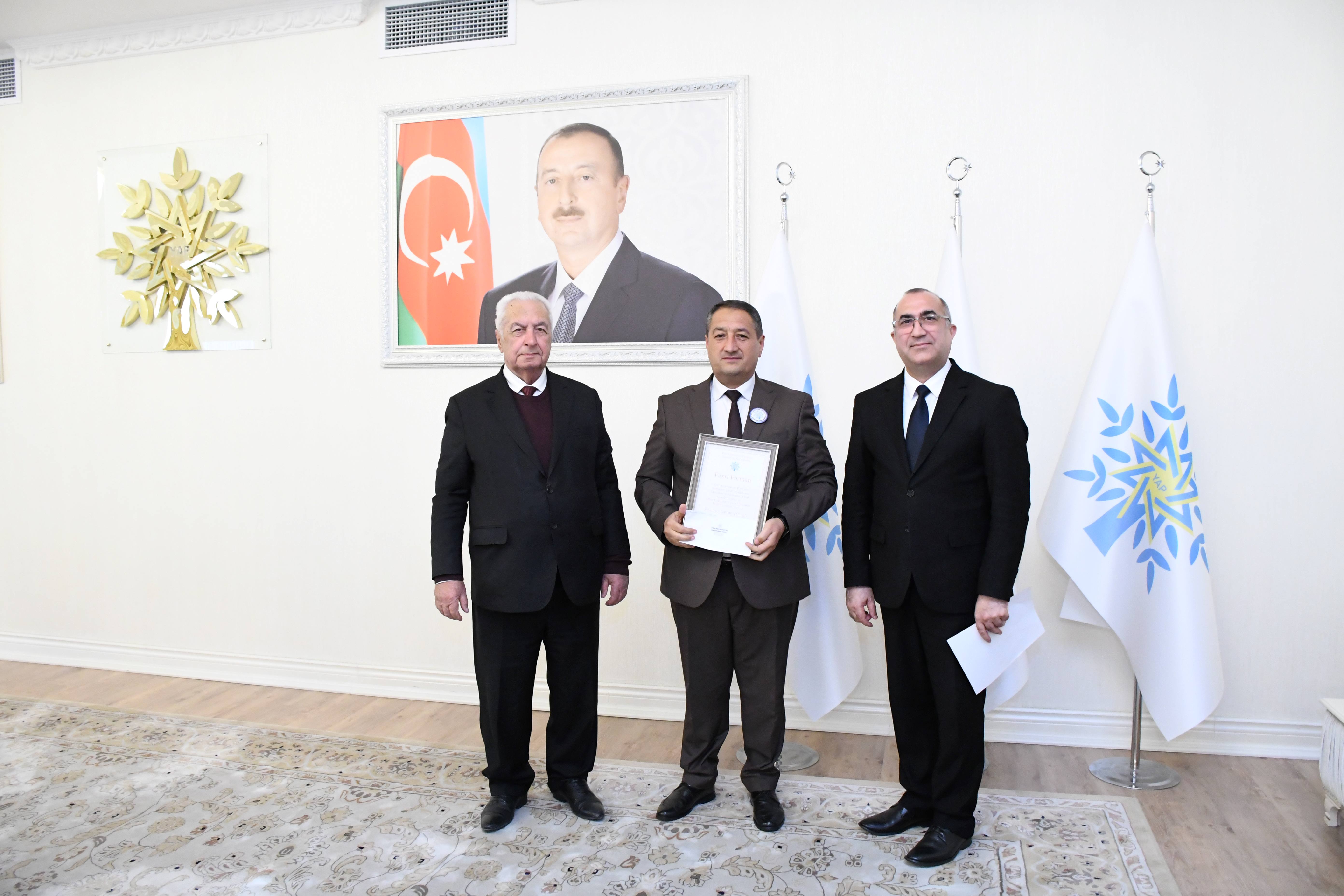 Sonra partiyanın və şəhərin ictimai-siyasi həyatında fərqlənən bir qrup şəxsə fəxri fərman, YAP sıralarına yeni qəbul olunanlara üzvlük vəsiqələri təqdim olunub.