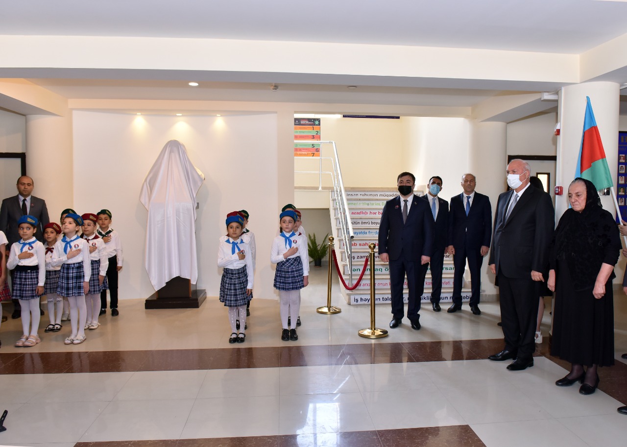 Açılışdan öncə büstün önündə məktəblilərin ifasında ədəbi- bədii kompozisiya nümayiş olunub.